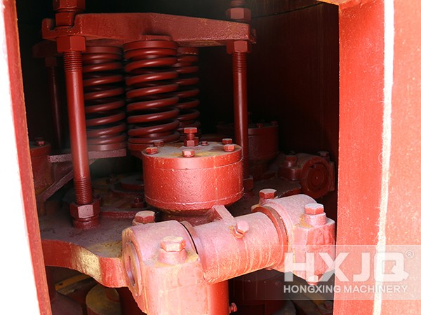 In the grinding chamber of the high pressure Raymond mill, the roll assembly is hanged on the roll supporter through the cross arm bearing. The roll supporter connects with the main shaft and blades. High pressure springs press the rolls tightly to the chamber. When the main motor starts, the blades and rolls rotate together; the analyzer is driven by transmission device and the speed of analyzer determines the fineness of materials.